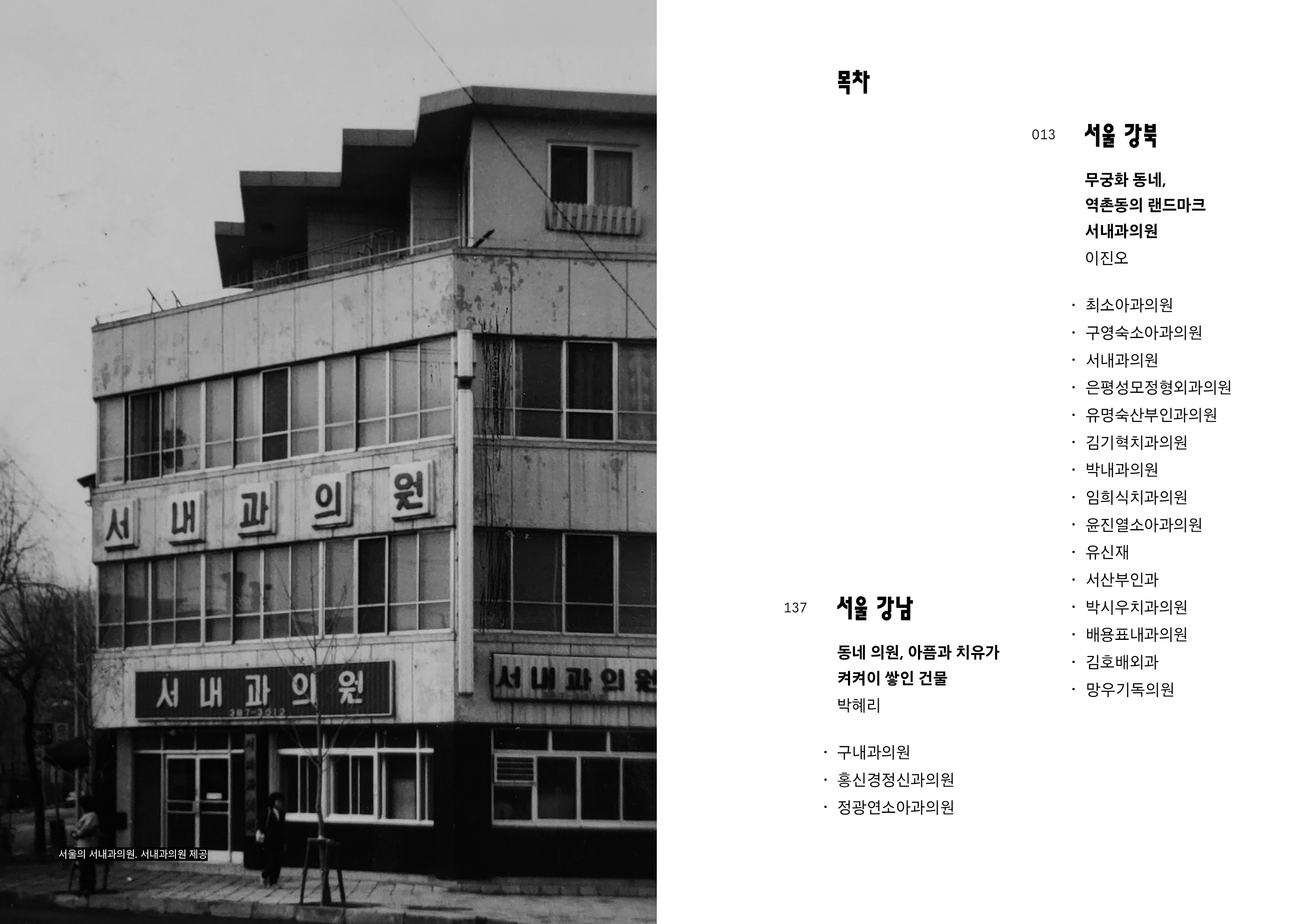 소규모 의원은 그 자체로 조금 특별한 생애주기를 지닌다. 일반적으로 소규모 근린생활시설은 임대를 전제로 지어지기 마련이라, 건축적 정체성과 가치를 갖기 어렵다. 하지만 의원은 다르다. 개업 의사의 오랜 꿈과 자본, 그리고 미래를 담아 지어진 공간이기 때문이다. 임대 수익보다 짓는 이의 이상이 앞서는 건물들. 그래서인지 동네 의원 건물은 건축적으로도 특이성을 띠게 되고, 김중업이 설계한 서산부인과처럼 이름 있는 건축가의 손길이 닿은 사례도 심심치 않게 발견된다. 반대로 특별한 외형 없이도 묵묵히 자리를 지키며 동네 풍경의 일부가 된 경우도 적지 않다.