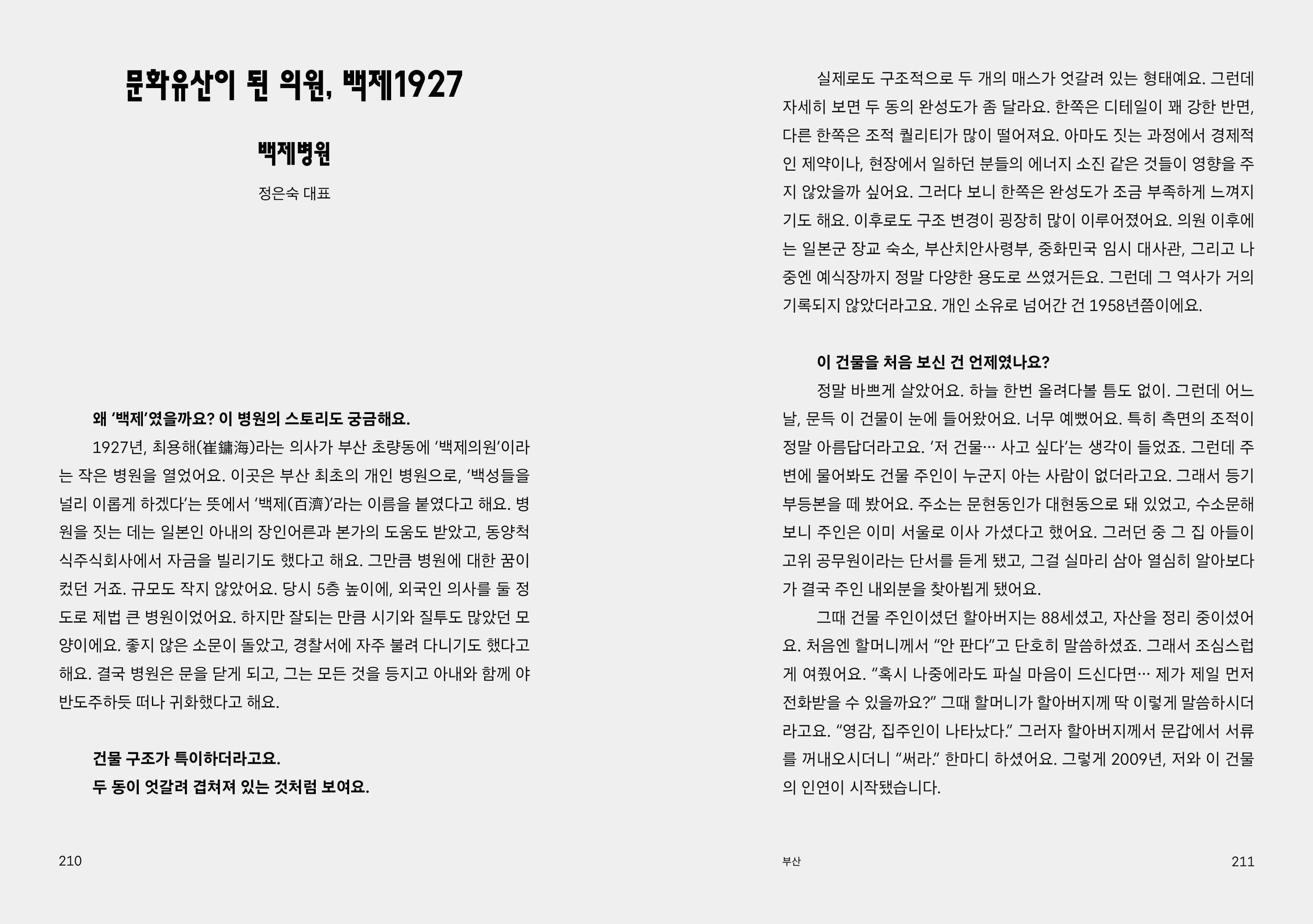 오래된 건물과 그곳만의 기억을 캐고 기록하는 ‘초현실부동산’이 동네 의원에 관심을 둔 것은 지극히 당연한 일이었다. 오래되었지만 듬직한 건물을 기웃거리다 보니 자꾸 눈에 들어온 게 바로 동네 의원 건물이었다. 서산부인과, 서내과의원, 유명숙산부인과의원 그리고 이름도 사연도 궁금한 수많은 공간들. 그러던 어느 날, 운영자 여섯 명이 모두 모인 자리에서 누군가가 던진 질문 하나가 이번 책의 시동을 걸었다. “근데 동네 의원이 왜 자꾸 우리의 레이더망에 들어오는 걸까? 혹시 다들 뇌리에 남아 있는 동네 병원 하나씩은 있지 않아?”